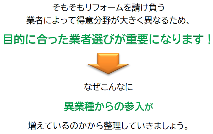 業界大手の家電量販店や業界大手の総合小売業とディスカウントストア、そしてこれまた業界最大手のオンラインストア、まったく経路の違う業種が続々とリフォーム業界に参入しています。