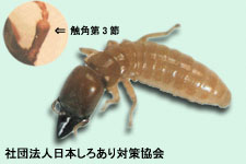 ヤマトシロアリと同様に被害報告が多い種類。侵入経路は地面・地下からで乾燥した木材でも水を運び湿らせてから加害するため、天井まで被害が及ぶこともある。 ヤマトシロアリより少し大きく、被害の進行が早く甚大な被害を及ぼす。 羽アリは体が薄褐色で、走光性があり群飛後電灯の下などに集まる。 兵隊アリは頭の形が丸っぽく、警報フェロモンを出す際に頭部から粘液を出す。 加害部分だけでなく巣を処理することが重要。