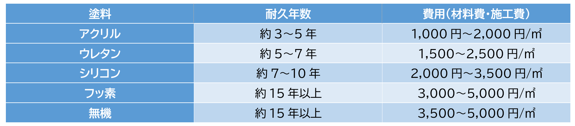 高価な塗料ほど、耐久性も高くなります、下の表を参考にしてください。