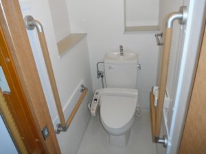 車イスのまま入ったり、介助が必要な人と入る場合では、トイレもある程度の広さが必要。もちろん、手すりもあると良いかと。