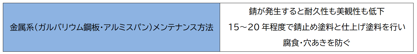 その手目、これらの素材を使用する場合は腐食や穴あきを防止する目的で、15~20年程を目処に錆止め塗料と仕上げ塗料によるメンテナンスをしっかりと行っておきましょう。
