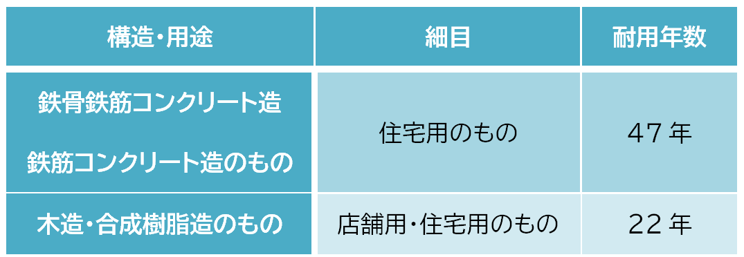 例えば、木造住宅の耐用年数は22年、鉄筋コンクリート造住宅の耐用年数は47年と示されています。
