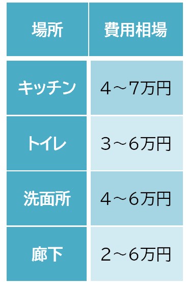 キッチンには家具屋調理器具が多く施工に手間がかかるので、ほかの場所に比べると費用が高くなる傾向になります。