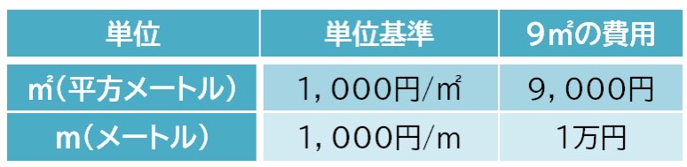 「㎡」記載については、そのまま1平方メートルあたりの費用と解釈すればよいので、わかりやすいのですが、「m(メートル)」記載は1mあたりの費用になっており、問題となるのは幅です。