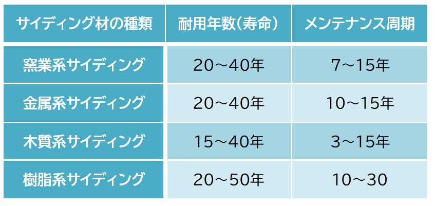 各サイディング材は寿命及びメンテナンスの周期は以下の表を参考にしてみてください。