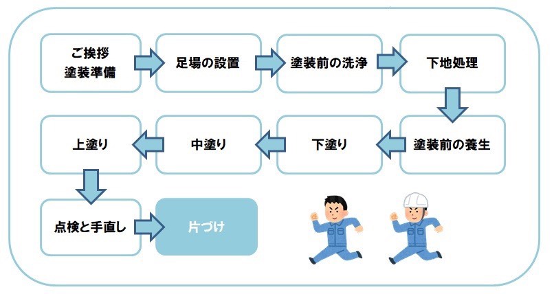 外壁塗装をする際、どれくらいの期間が必要なのか、どのような手順で作業をしているのか気になりますよね。