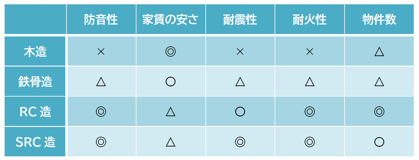 木造は共に×、鉄骨造は△でRC造とSRC造は耐震耐火ともに優れていますが、SRCの方が鉄骨が入っている分強度があります。ただそれほどの差はありません。