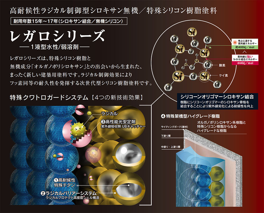 レガロシリーズは、特殊シリコン樹脂と無機成分「オルガノポリシロキサン」との出会いから生まれた、今までにない塗料です。