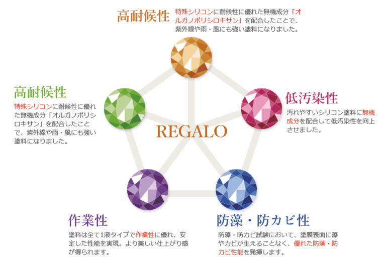 レガロシリーズは特殊シリコンに耐候性が優れた無機成分「オルガノポリシロキサン」を配合して生まれた、紫外線や雨・風に強い塗料「レガロシリーズ」。汚れやすいシリコン塗料に無機成分を配合して低汚染性を向上。優れた光沢性と艶やかな塗膜とともに、汚れの付着が少なくきれいな状態を長続きさせてくれる塗料です。