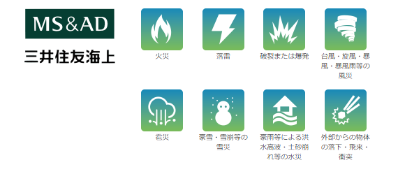 火災・落雷・破裂・爆発/ 風災・雹災・雪災/ 他物の落下・飛来・衝突/台風・暴風雨・豪雨等による洪水・高潮・土砂崩れなどの水災による損害等