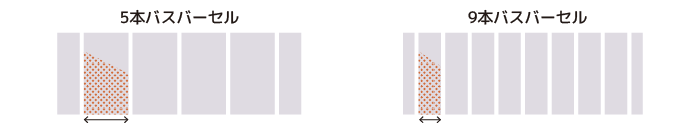 従来の5本バスバーセルから、9本バスバーセルに変更。出力低減の要因となるバスバー間の距離を50%低減させました。