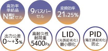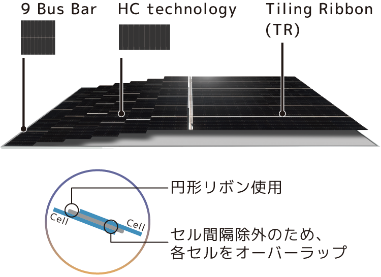 タイリングリボン(TR)技術で変換効率アップ!セル同士の間隔を排除し、モジュール変換効率を大幅に向上しています。9本バスバーを導入することで、出力損失低減を実現しました。