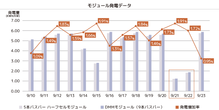 従来の5本バスバーセルのモジュールと比較し、1.57%出力向上を実現。