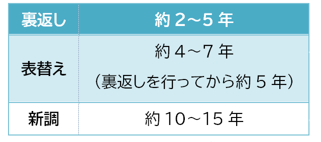 交換の目安時期としては、2~5年くらいで「裏返し」、4~7年くらい(もしくは裏返しを行ってから5年前後くらい)で「表替え」、10~15年くらいで「新調」のリフォームを検討すると良いでしょう。