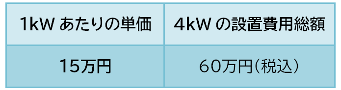 太陽光発電の設置費用が1kWあたり15万円の場合、4kWの太陽光発電の設置には、60万円かかります。