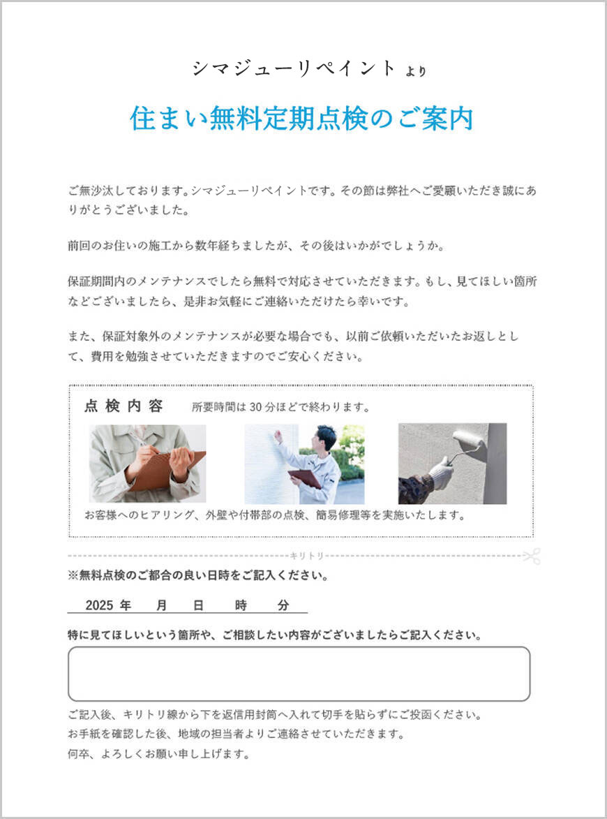 本当に安心して暮らしていただけるように、アフターメンテナンスとして、必要な時期に点検を実施!